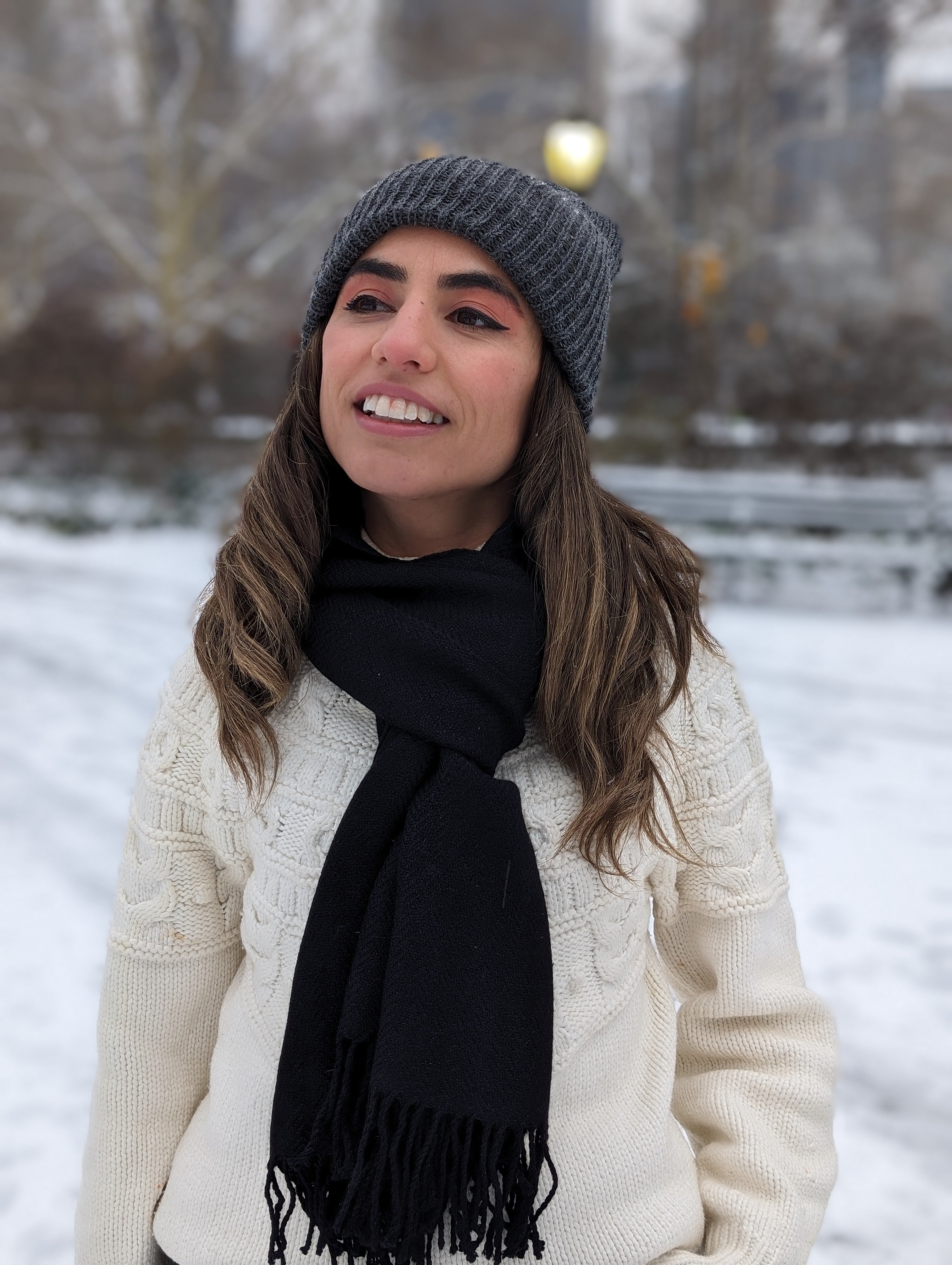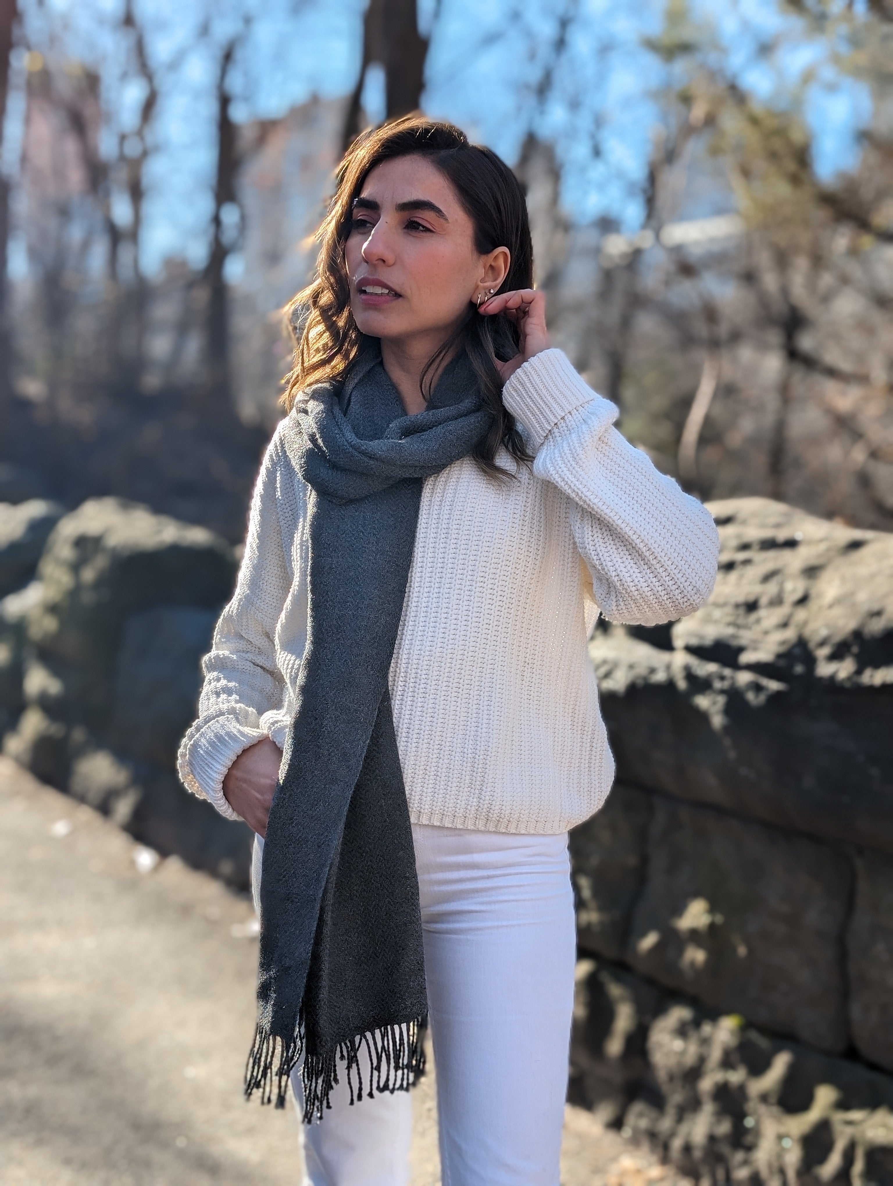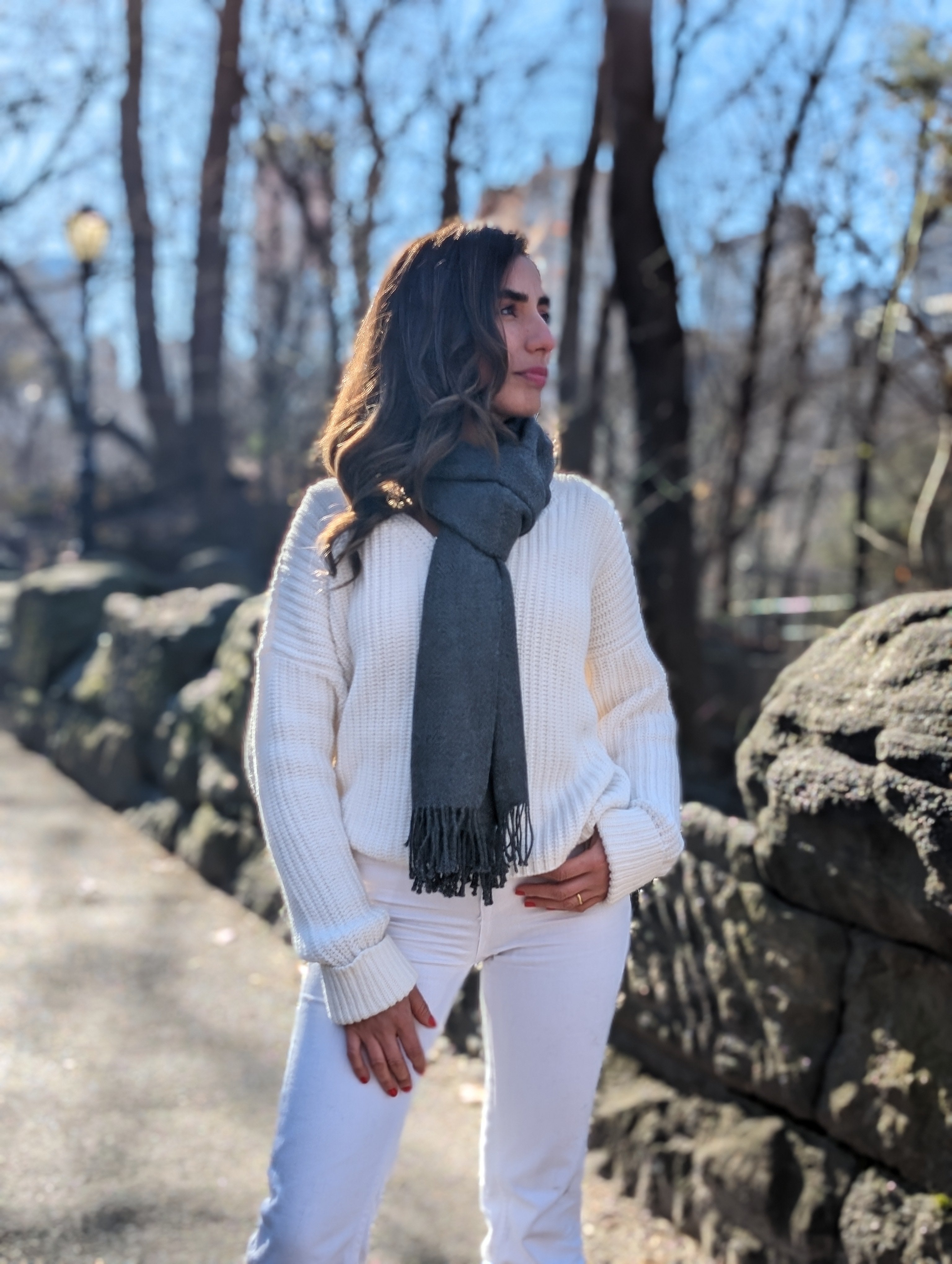 Woman wearing a red scarf and light sweater in Central Park
